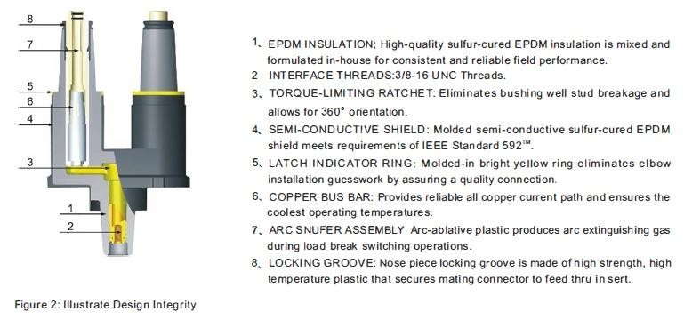 The product is molded from sulfur-cured EPDM insulating and semi-conductive rubber, providing excellent electrical insulation, stress control, and environmental sealing. When used with matching components, it forms a fully shielded and submersible connection system.