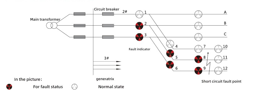 Based on the characteristics of short-circuit faults, the action criterion is the sudden change in current accompanied by the power failure of the protection device. The interpretation logic of the fault indication diagram is as follows: if indicators 2, 5, and 8 of phase A and indicators 3, 6, and 9 of phase C of line 2 all turn red, while indicators 11 and 12 remain white, then it can be determined that a short-circuit fault has occurred at that outgoing line point.